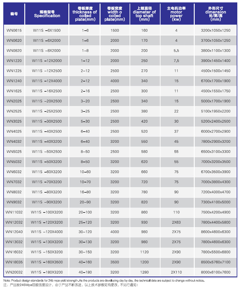 W11S 系列上輥萬能式卷板機,引進日本技術生產,上輥可以垂直升降也可以水平方向移動。采用上輥直接加壓方式,可以控制板材剩余直邊的長度和形狀??梢跃碇贫喽位⌒?、方形、圓形、錐形、等工件。
